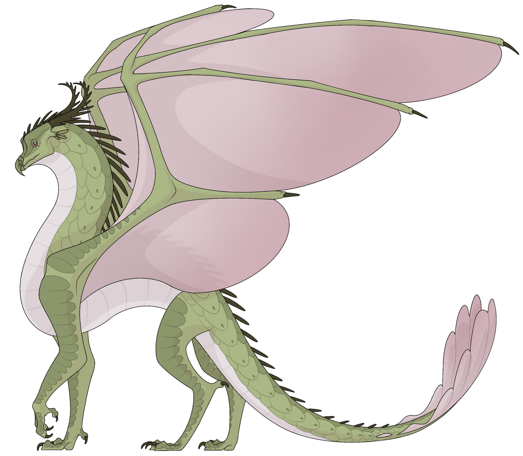 Grasswings are rounded-spine-lined, graceful, and lean dragons. Their spines almost look like feathers. but they very much aren't. They have an unusually curved and sharp snout and come with many different beautiful scale patterns. Their wings have also been said to resemble flower petals. They have rounded and kind eyes, and their scales glitter like sequins in the sunlight. They also have double-finned tail tips to assist heavily in flying.Grasswings commonly come in greens, yellows, pinks, purples, browns, and whites.